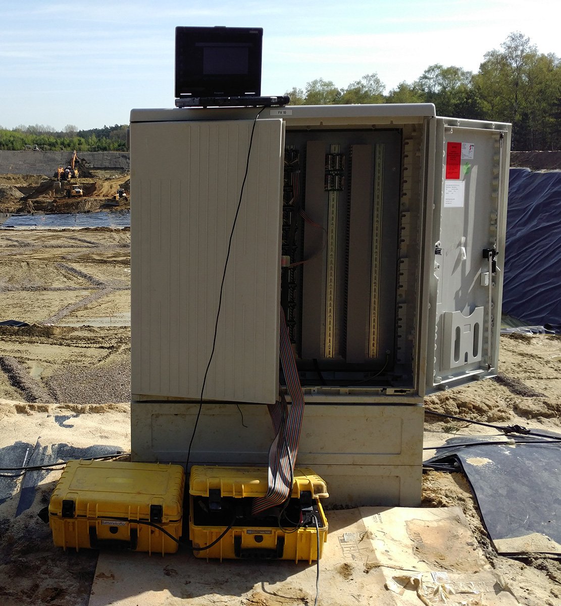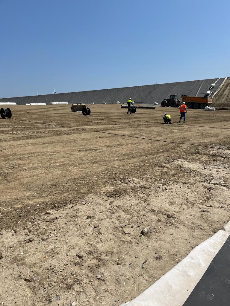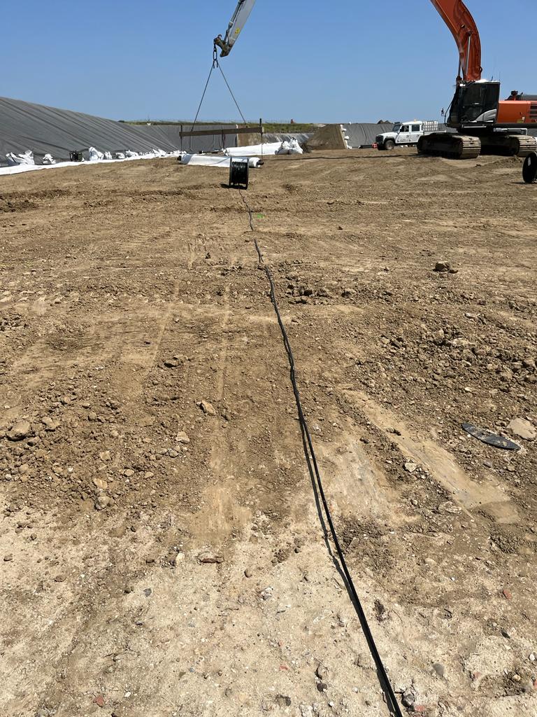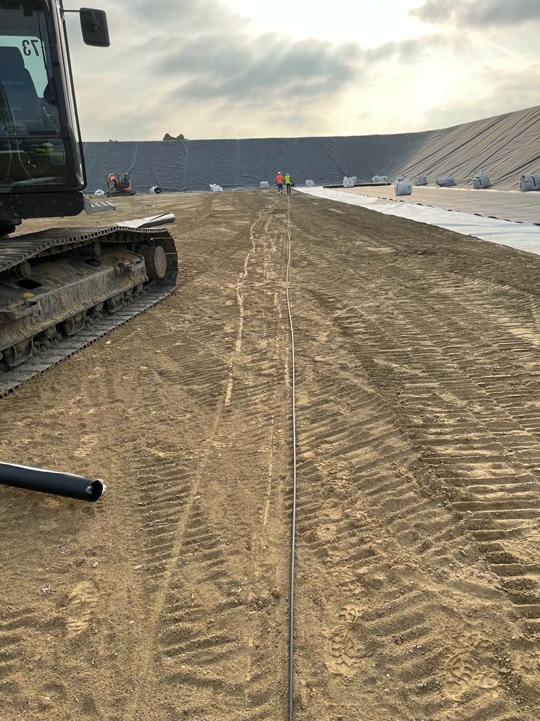 The measuring cables of the system are installed before the installation of the geo membrane. These are unrolled in parallel at intervals of several meters.